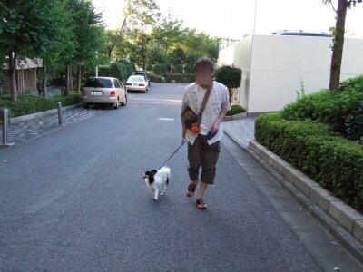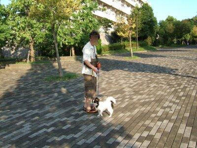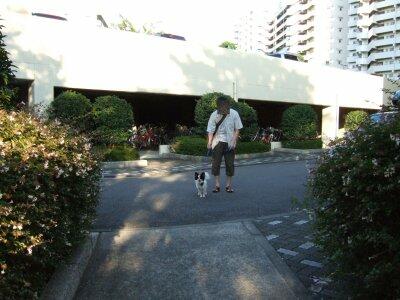 大きな団地の横を通って行きます。行きかう人々、みんなにお愛想して歩く、八方美人なココ。