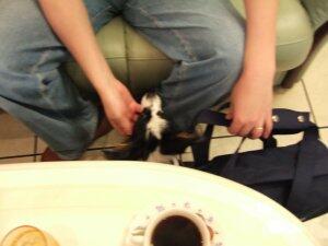 翌朝のモーニングコーヒーの間は、ココはキャリーバッグの中です。