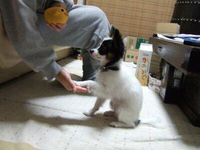 おもちゃのピヨコちゃん欲しさに、お手してます。